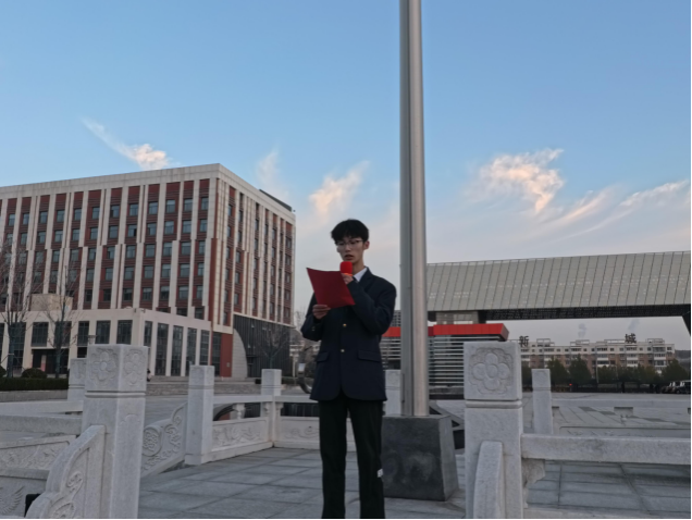 在全体师生的注目下,国旗护卫队步伐铿锵,护卫国旗庄严入场。伴随着雄壮的《义勇军进行曲》,五星红旗冉冉升起,迎风舒展。全体师生齐声高唱国歌,肃立致敬。青春意气与爱国情怀在晨光中交织升腾,为整场仪式注入了昂扬向上的精神力量。